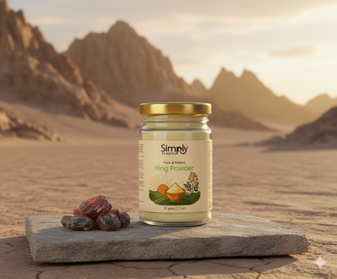 Hing (Asafoetida) is a resin extracted from Ferula plants—known for its potent volatile oils that help relax intestinal muscles and support smooth digestion. Unlike diluted commercial versions, Simply Staples Hing contains pure resin, delivering maximum carminative activity and authentic flavor intensity.